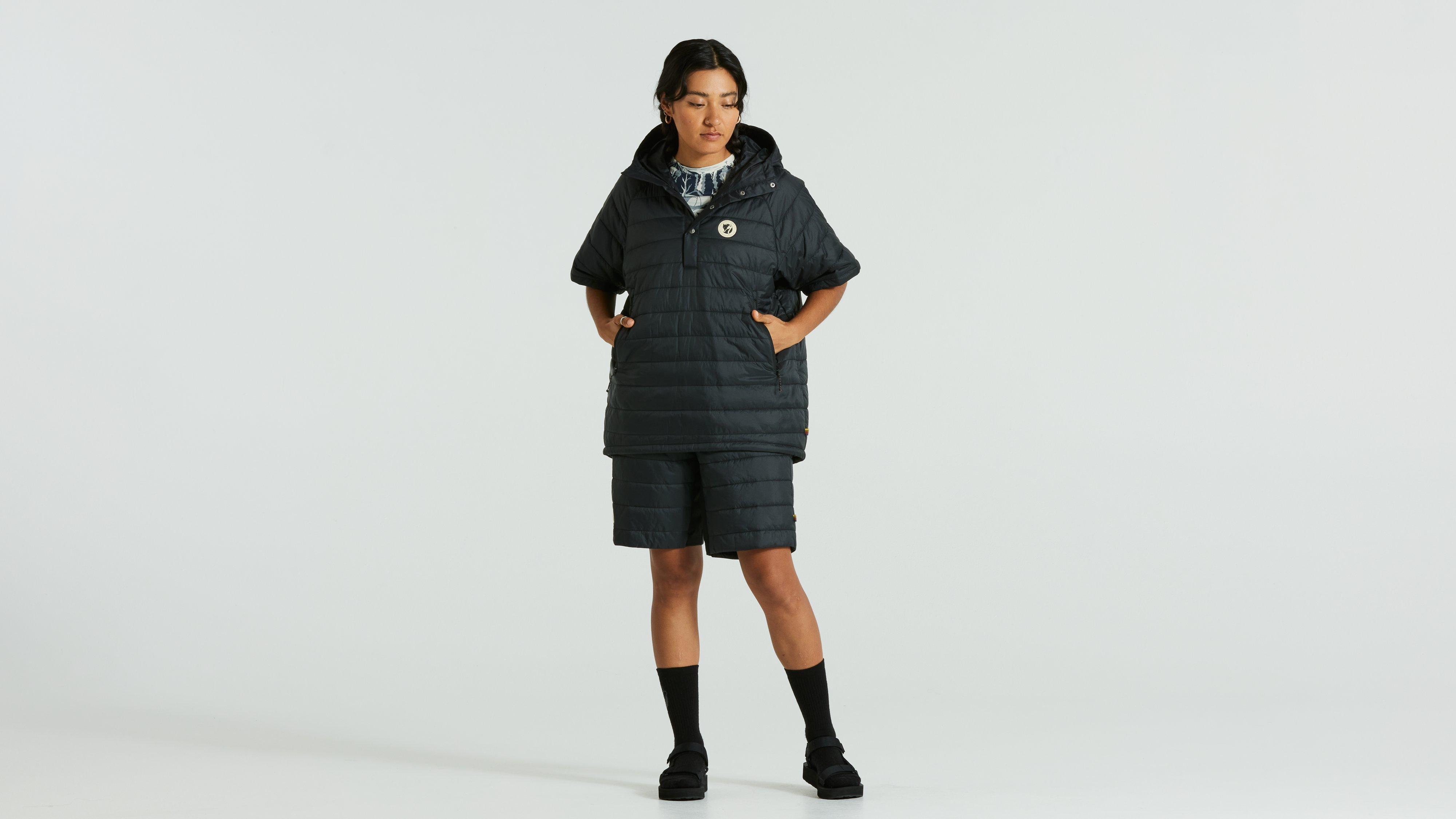 Packable, lightweight insulated unisex anorak. Lightly padded with synthetic insulation and an outer layer in pliant, recycled polyamide. Optimized for long bike rides as a reinforcement layer for men and women. Adjustable cinch hood and cinch for adjusting the hem to stop air from flowing up. Packs into kangaroo pocket. Unisex fit. Part of the Specialized/Fjällräven series for urban rides and bikepacking adventures.