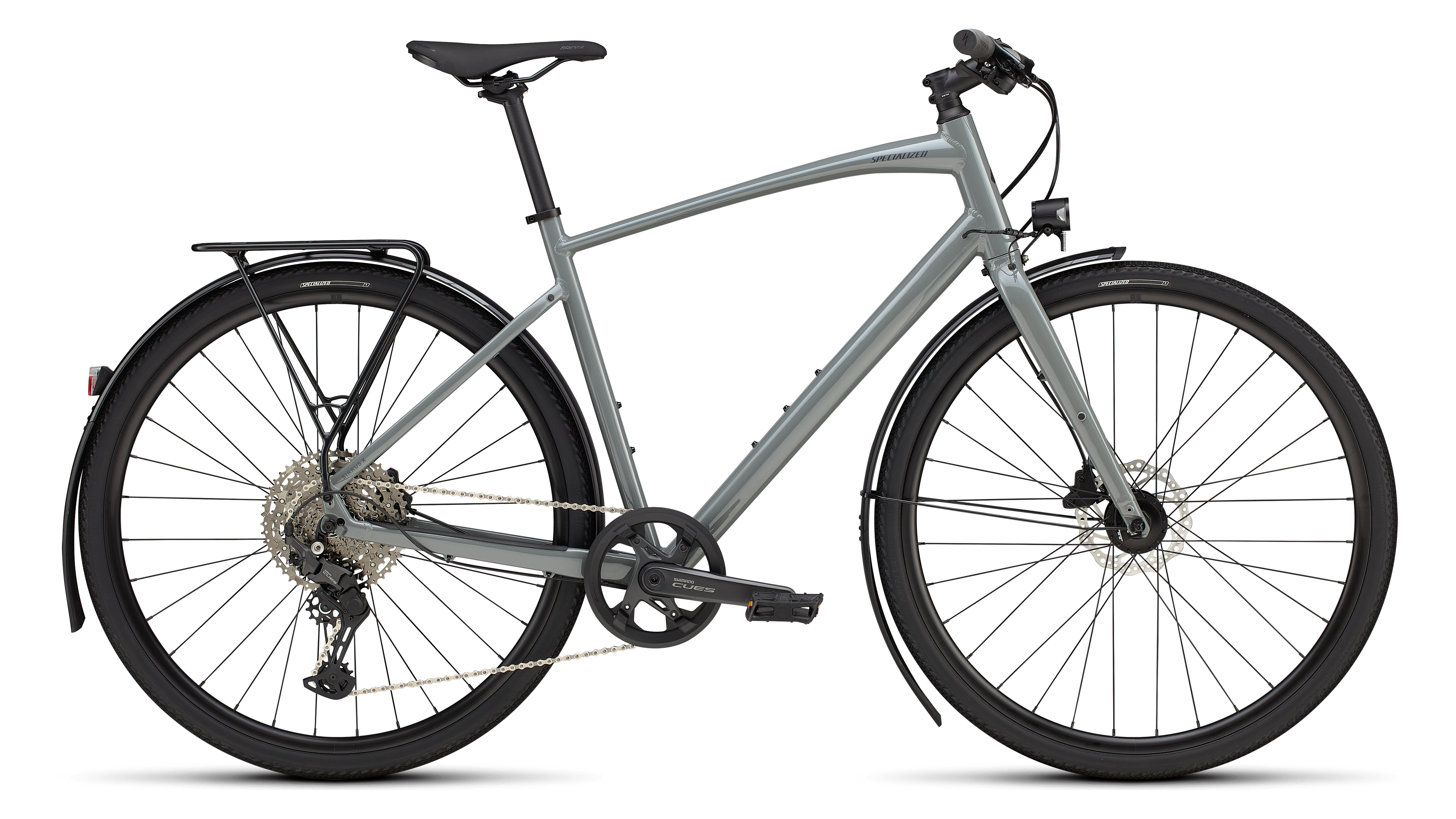 | Frame | Specialized A1 Premium Aluminum, Fitness Geometry, butted tubing, internal cable routing, flat-mount disc, quick-release, Plug + Play rack/fender mounts |